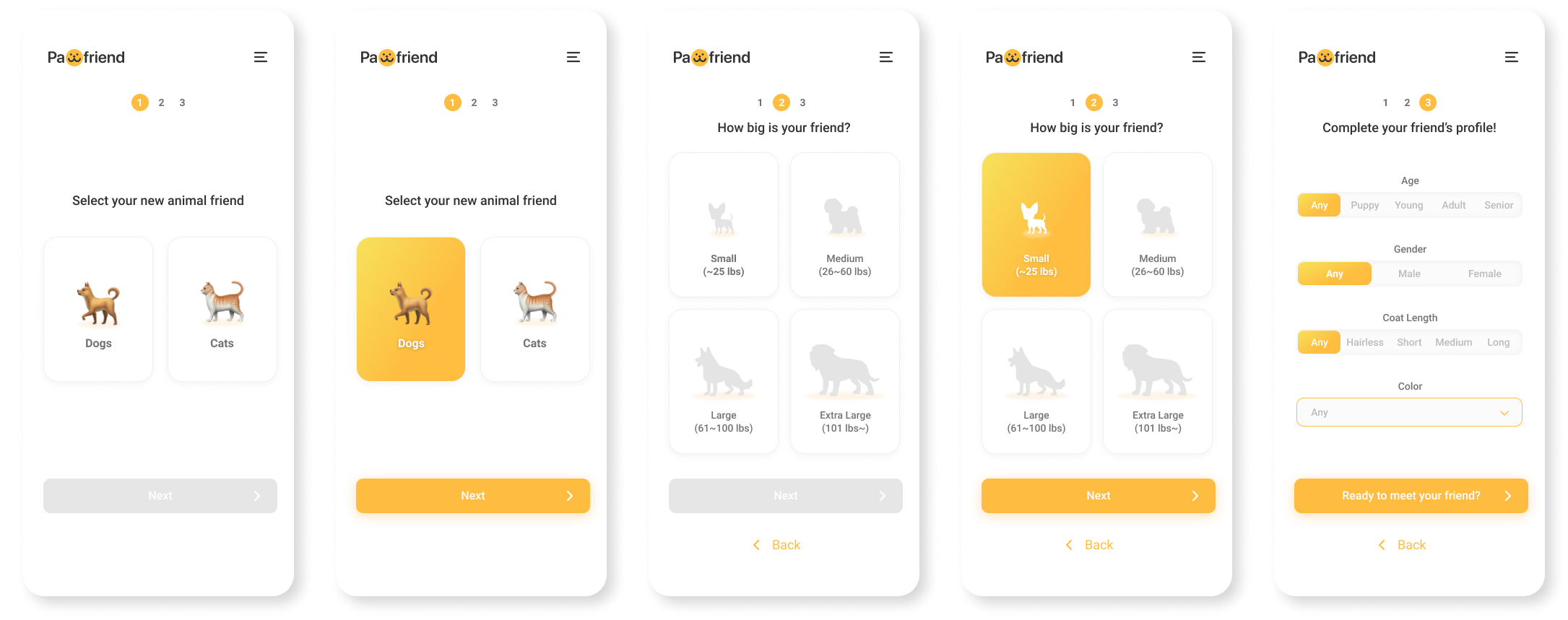 From the research and interviews our team has collected, we’ve found a consistent pain point that has appeared within almost every pet owner’s first-time journey: “I have some idea of what kind of pet I want to adopt. But how do I know if they’re the right fit for me and my life?”