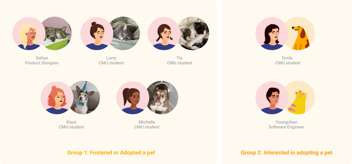 We conducted Semi-structured Interviews and Contextual Inquiry (Directed Storytelling) with our potential users. Largely, there were two groups of our target users: people who have experience in adopting or fostering a pet and people interested in adopting a pet in the future.