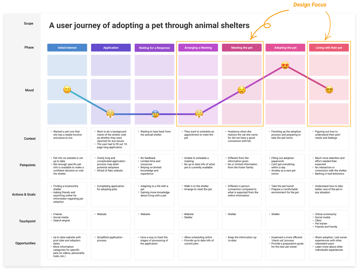 We first split the customer journey into seven phases, encompassing the whole journey from making the initial decision to adopt, to the adoption process, to living with the pet. For each step, we provided context, which is the data that we collected that we found the most relevant for what we want to accomplish in our project. Following individual users' journeys helped us empathize and understand the user's pain point better. We also included touchpoints at each phase to determine what customers interact with and find any opportunities to change our website to improve the status quo.